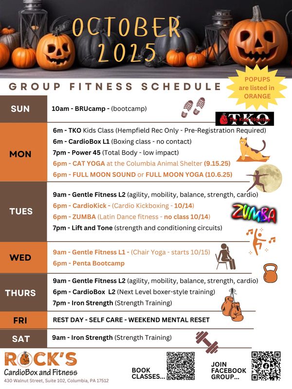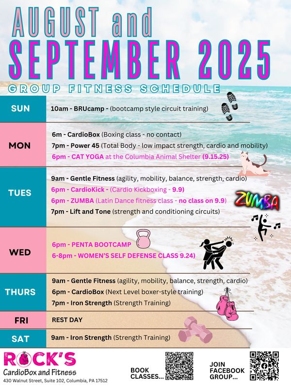 Please contact us to inquire about up to date hours or check the Punchpass app for classes and courses: https://rockscardiobox.punchpass.com